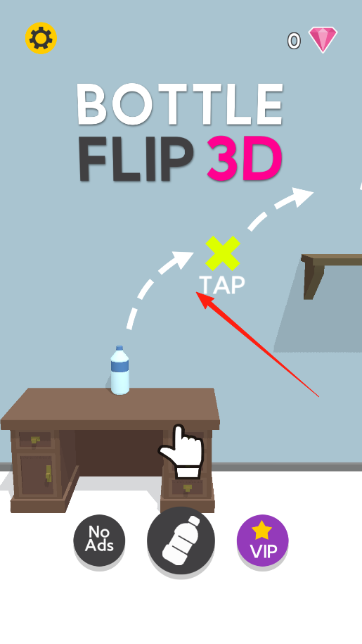 1、進(jìn)入游戲,桌上有個水瓶,按提示在屏幕TAP位置點,控制水瓶翻轉(zhuǎn)跳躍,把握好點擊時機(jī),讓水瓶越過障礙,落到目標(biāo)平臺,完成關(guān)卡挑戰(zhàn),試試能跳多遠(yuǎn)。