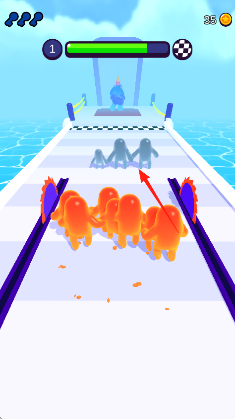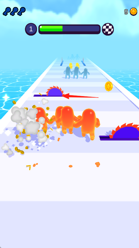 1、跑酷階段,控橙色blob群,避鋸片等障礙,吃金幣,撞藍(lán)色blob可吸收壯大,看進(jìn)度條1級積累數(shù)量,提升軍團(tuán)規(guī)模。