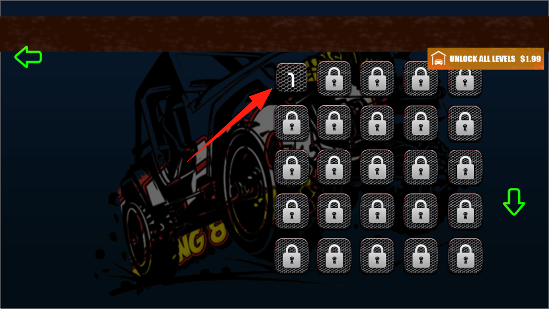 1、點(diǎn)擊屏幕中央的位置按鈕,進(jìn)入游戲,操控綠色拖拉機(jī)開(kāi)始越野駕駛挑戰(zhàn),點(diǎn)擊選擇關(guān)卡。