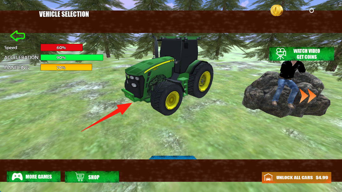 2、在車(chē)輛選擇界面,確認(rèn)綠色拖拉機(jī)的速度、加速度、操控等屬性后,點(diǎn)擊拖拉機(jī)進(jìn)入游戲。
