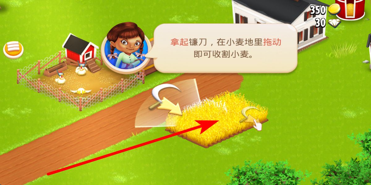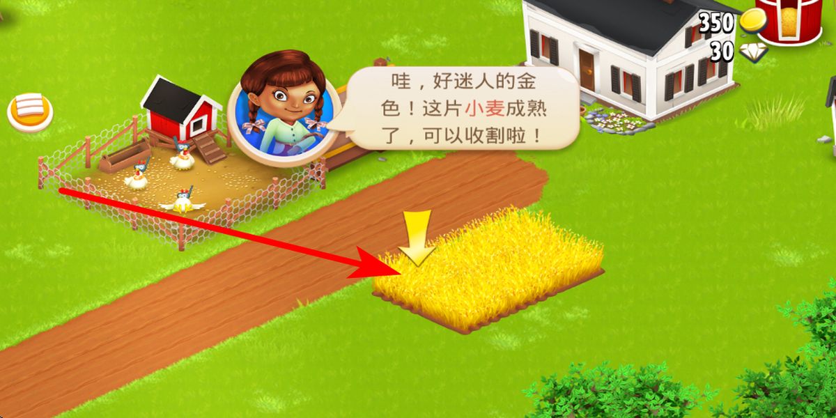 1、留意角色提示,當(dāng)畫面清晰顯示小麥成熟時(shí),要快速找到帶有黃色箭頭指向的成熟小麥區(qū)域,提前檢查工具做好準(zhǔn)備以開展收割操作。