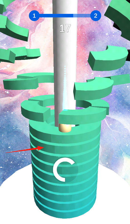 2、控制金色小球順著白柱往上爬,要躲開旋轉(zhuǎn)的青綠色障礙物,數(shù)字17顯示當(dāng)前高度,進(jìn)度條告訴你離下一個(gè)目標(biāo)還有多遠(yuǎn),碰到帶C字母的圓柱會(huì)有特殊效果。