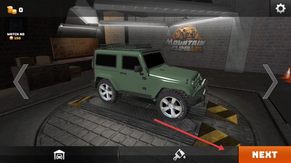 1、在車庫界面,確認(rèn)停放在平臺上的綠色越野車,點擊右下角橙色NEXT按鈕,進(jìn)入沙漠場景的LEVEL1挑戰(zhàn)。