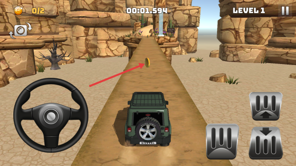 2、駕駛過程中,通過方向盤控制行駛方向,利用油門與剎車按鍵調(diào)節(jié)車速,沿路徑拾取金幣,同時避開巖石障礙。