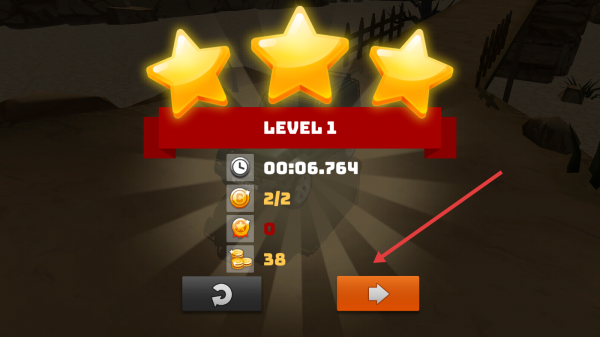 3、成功完成LEVEL1后,獲得3星評價,用時00:06.764且收集2個金幣,點擊橙色箭頭解鎖新關(guān)卡,積累金幣升級車輛。