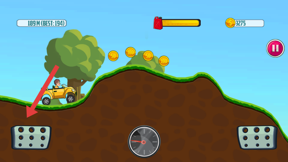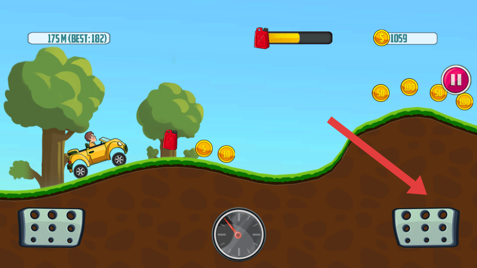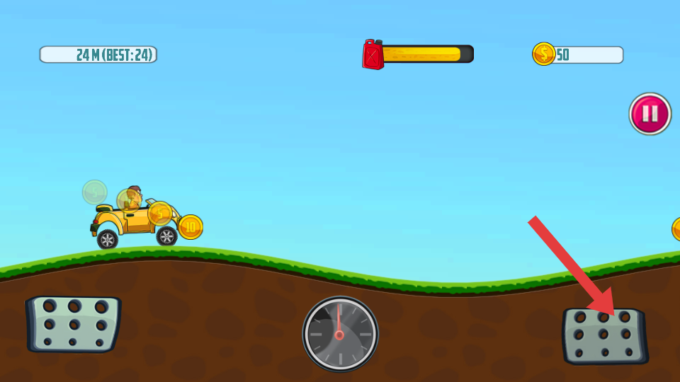 2、注意燃油量頂部紅油罐,遇到上坡如綠色草坡,長按右側(cè)的油門無明確圖標(biāo),通過按鍵操作控制。