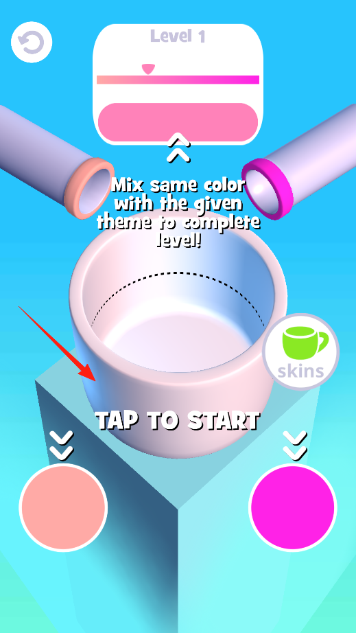 1、進(jìn)入涂鴉冰激凌,點(diǎn)擊TAP TO START,要選左右兩邊的顏色,把相同顏色混合,和給定主題匹配,這樣才能完成第一關(guān)。