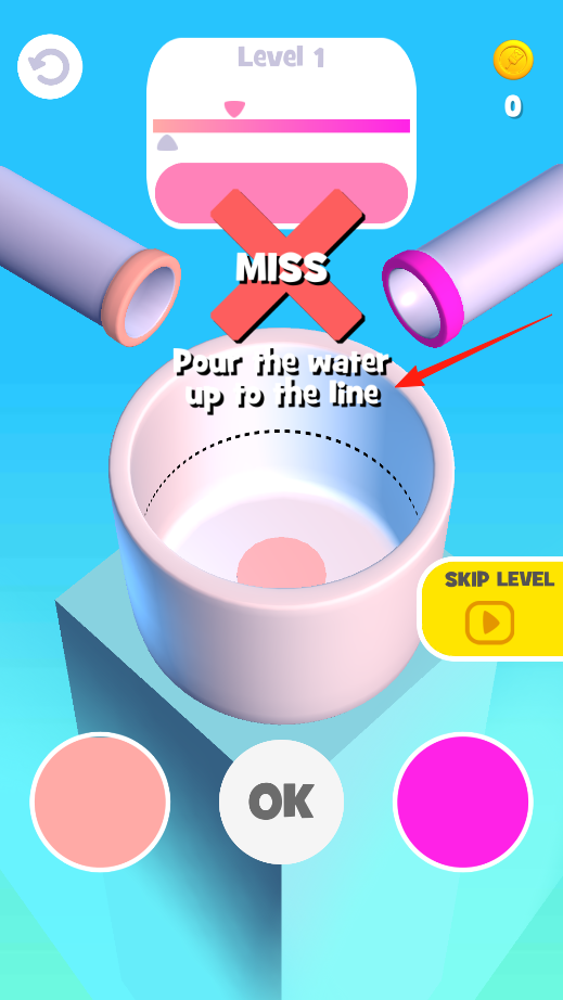 1、點(diǎn)擊控色完成混色:玩家只需輕觸屏幕讓顏色流出,松手停止傾倒,根據(jù)需要調(diào)整顏色可多次按沖洗按鈕,倒入液體直至到達(dá)容器管線,為涂色做好準(zhǔn)備。