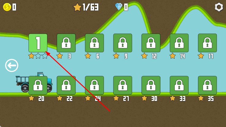1、進入游戲,選藍色卡車,點擊START開始,選擇關(guān)卡1,在崎嶇地形駕駛。