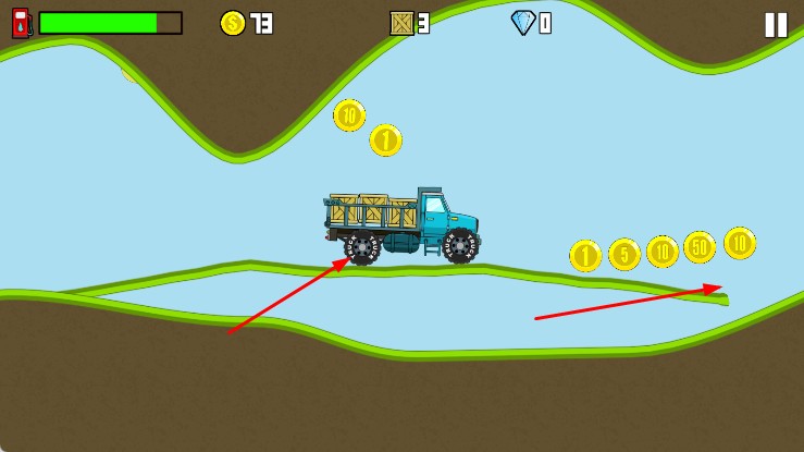 2、操控卡車行駛,收集空中金幣,遇到凹陷地形,需劃線鋪路,讓卡車平穩(wěn)通過,還可拾取油桶保持油量。