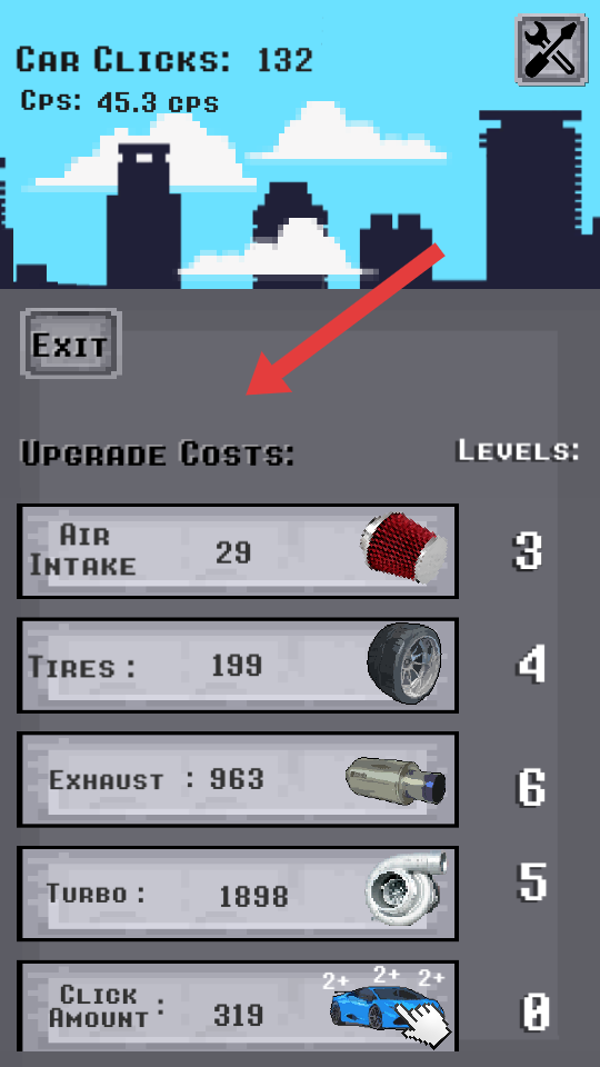 1、在升級(jí)界面,消耗累計(jì)的Car Clicks數(shù)值,選擇Air Intake、Tires等部件升級(jí),提升車輛屬性如CPS、速度潛力。