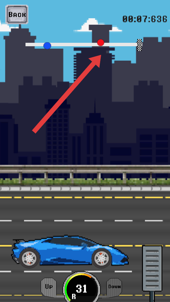2、進(jìn)入賽車模式后,操控藍(lán)色汽車,通過Up、Down按鍵加速,目標(biāo)超越賽道上紅色圓點(diǎn)標(biāo)記的對(duì)手位置,向終點(diǎn)沖刺。