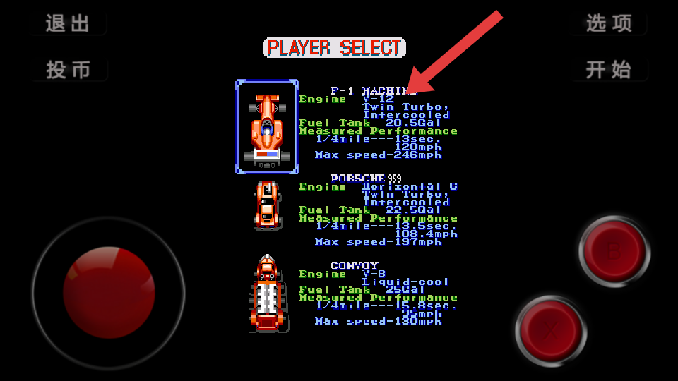 1、進入選車界面,選擇F-1MACHINE賽車,其具備Twin Turbo引擎等特性,參考性能數(shù)據(jù)選擇適配車輛開啟比賽。