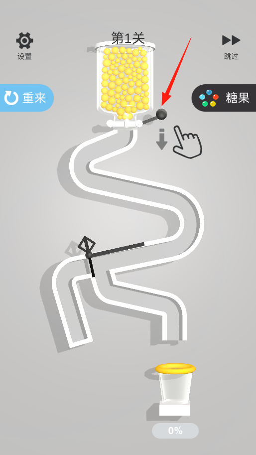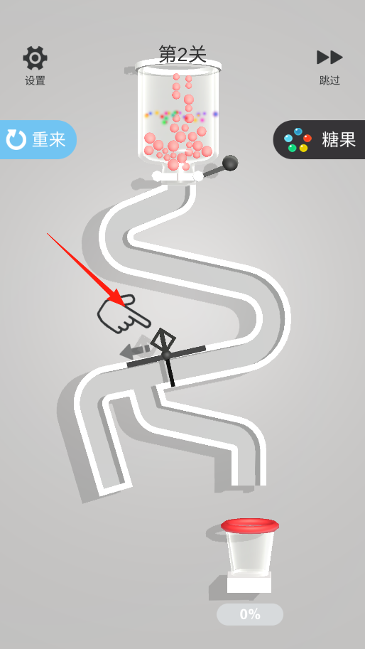 3、到了第二關(guān),上面容器里是粉色的小球,還有彩色的糖果,按照提示,操作管道里的機(jī)關(guān),調(diào)整管道的路徑,讓小球和糖果能順著管道落到下面紅色蓋子的杯子里。