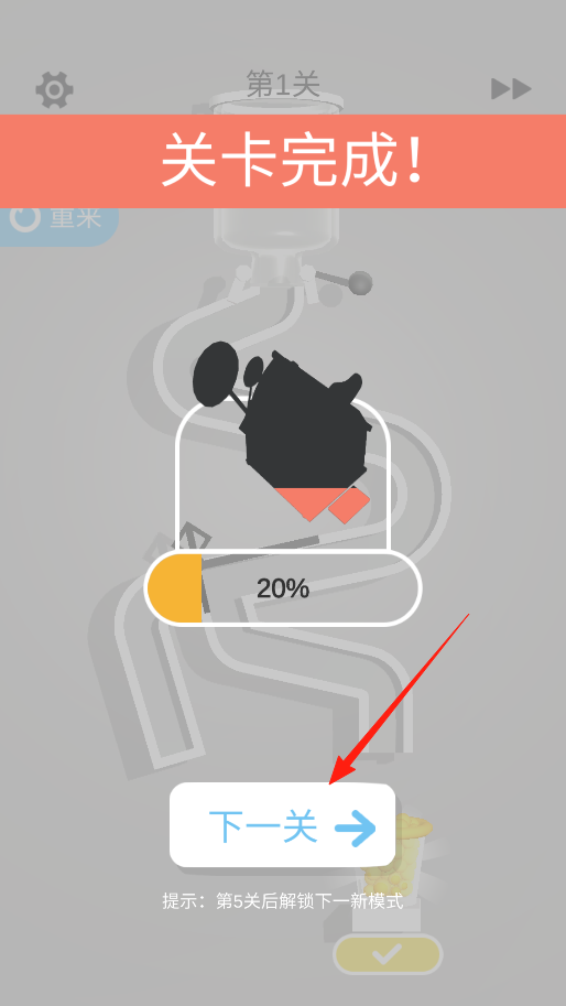 2、第一關(guān)完成啦,還有進(jìn)度條顯示完成了20%,現(xiàn)在點擊下一關(guān)按鈕,就能進(jìn)入第二關(guān),繼續(xù)體驗新的關(guān)卡內(nèi)容,看看第二關(guān)會有什么不同的挑戰(zhàn)。