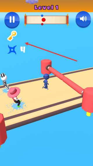 2、Level1中,瞄準(zhǔn)敵人,投擲手里劍飛鏢,注意避開(kāi)旋轉(zhuǎn)紅錘等障礙,收集鑰匙,推進(jìn)關(guān)卡。