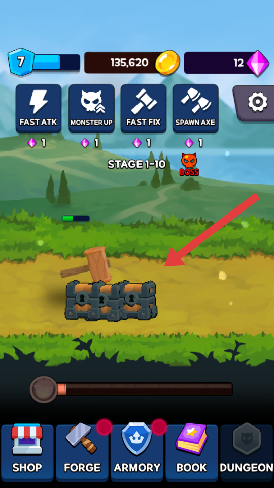 1、在STAGE1-10關卡,快速點擊使用錘子對對面的怪物進行捶打,擊敗敵人后獲得寶箱,點擊打開寶箱獲取金幣資源。