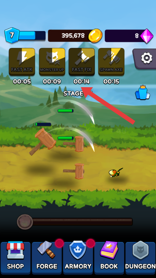 2、戰(zhàn)斗時觀察上方技能欄如FAST FIX,把握冷卻時間,適時釋放技能召喚錘子攻擊敵人,清理關卡怪物,推進Stage進度。