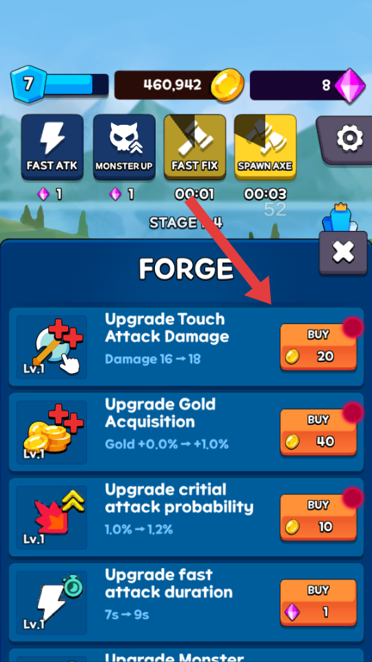3、點擊底部FORGE按鈕進入鍛造界面,消耗金幣升級Attack Damage等屬性,提升攻擊傷害,增強后續(xù)戰(zhàn)斗能力。