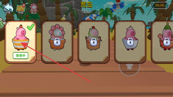 1、在角色選擇界面,選已解鎖的粉色小豬角色顯示使用中,確認(rèn)后進(jìn)入游戲,可體驗(yàn)該角色在荒島場(chǎng)景的冒險(xiǎn)。