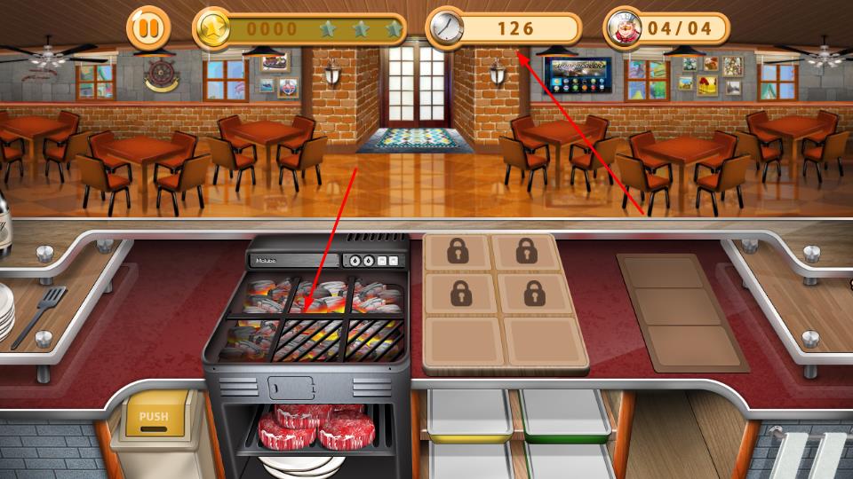 1、進入餐廳場景頂部顯示時間126、顧客數(shù)04/04、金幣0000,點擊烤架放置生肉,觀察烤制進度,適時翻轉(zhuǎn)確保熟透。