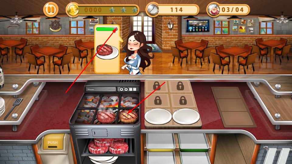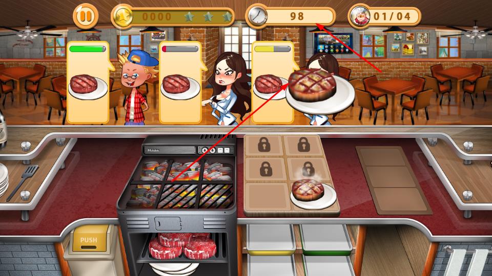 2、留意顧客頭頂訂單牛排圖案+進度條:綠色、紅色、黃色代表不同熟度需求,將烤好的牛排移至對應(yīng)餐盤,拖動餐盤交付顧客,滿足訂單獲金幣。