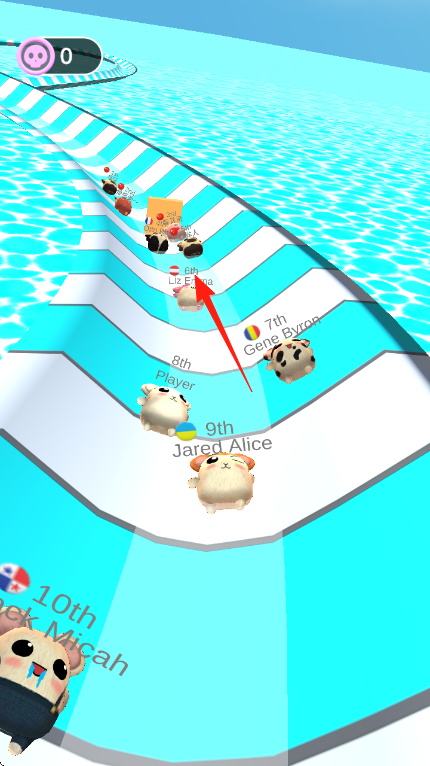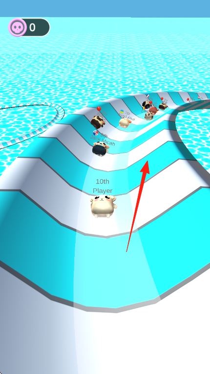 1、打開游戲進(jìn)入到主界面,操控動(dòng)物角色,沿水上滑道紅箭頭滑行,超越其他玩家,爭(zhēng)取領(lǐng)先。