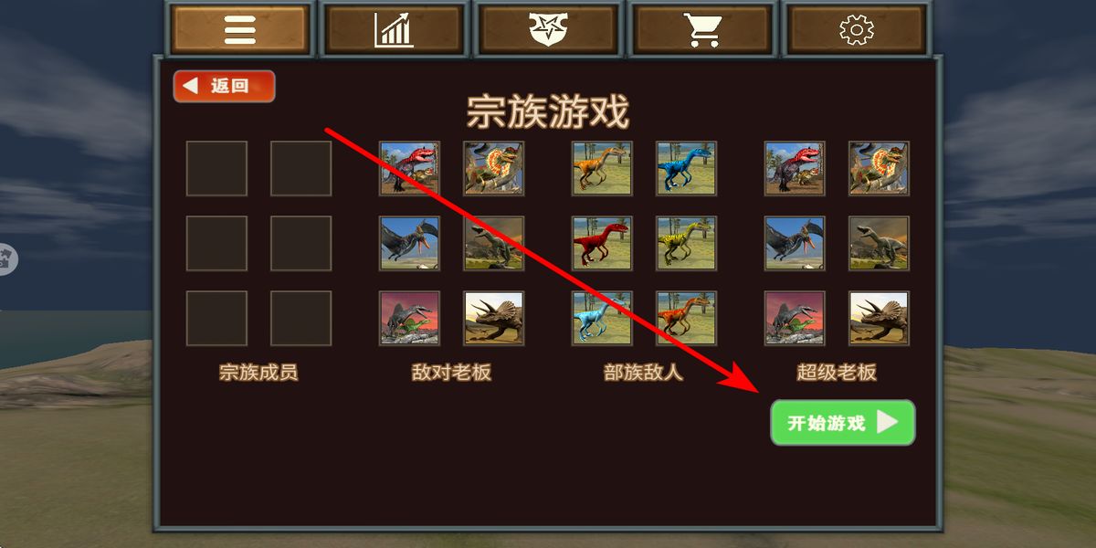 2、進(jìn)入宗族游戲界面,配置好宗族成員敵對(duì)老板等,點(diǎn)擊開(kāi)始游戲,參與宗族相關(guān)挑戰(zhàn),完成可獲獎(jiǎng)勵(lì),提升角色能力,為高階狩獵做準(zhǔn)備。