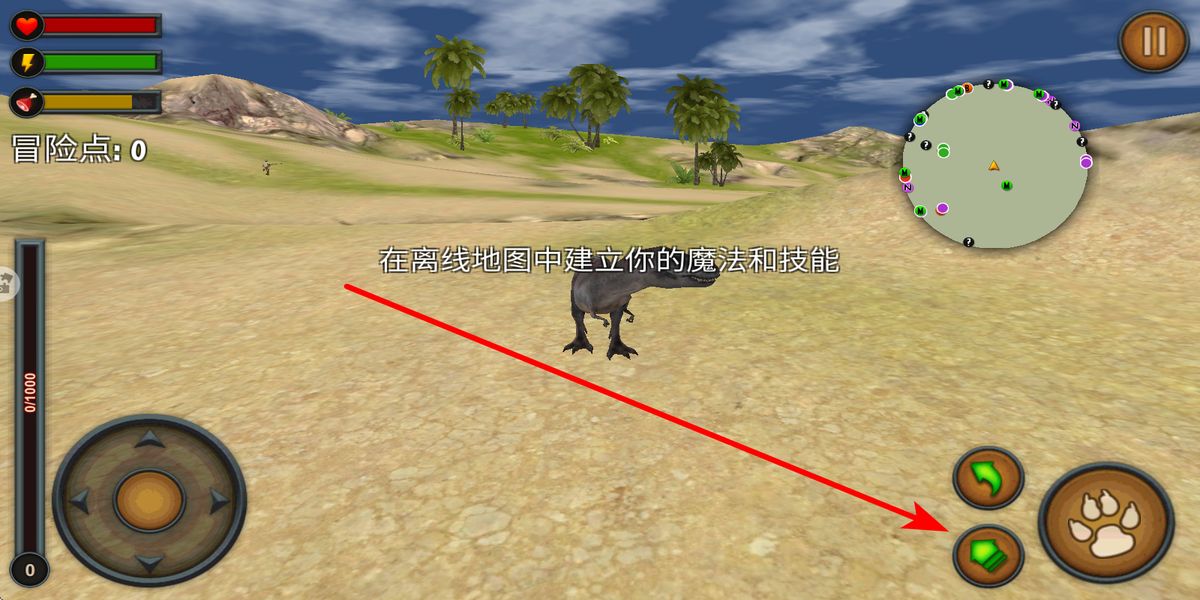 3、狩獵時(shí),利用右側(cè)技能按鈕釋放技能,結(jié)合恐龍習(xí)性制定策略,合理運(yùn)用技能與裝備,應(yīng)對(duì)恐龍攻擊,完成獵殺目標(biāo),提升狩獵效率。