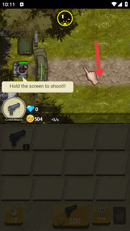 1、進(jìn)入游戲界面后,看到提示Hold the screen to shoot,長(zhǎng)按屏幕即可讓角色射擊,開(kāi)啟戰(zhàn)斗流程。