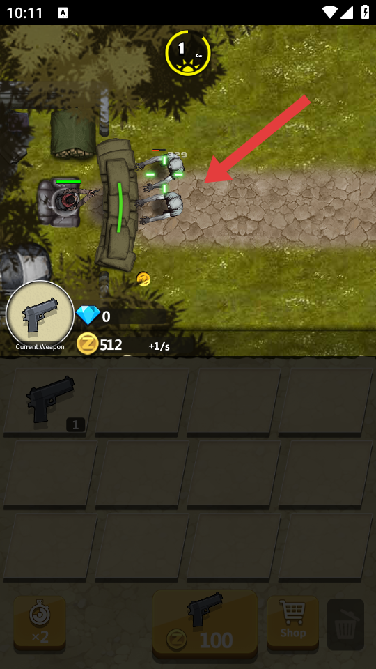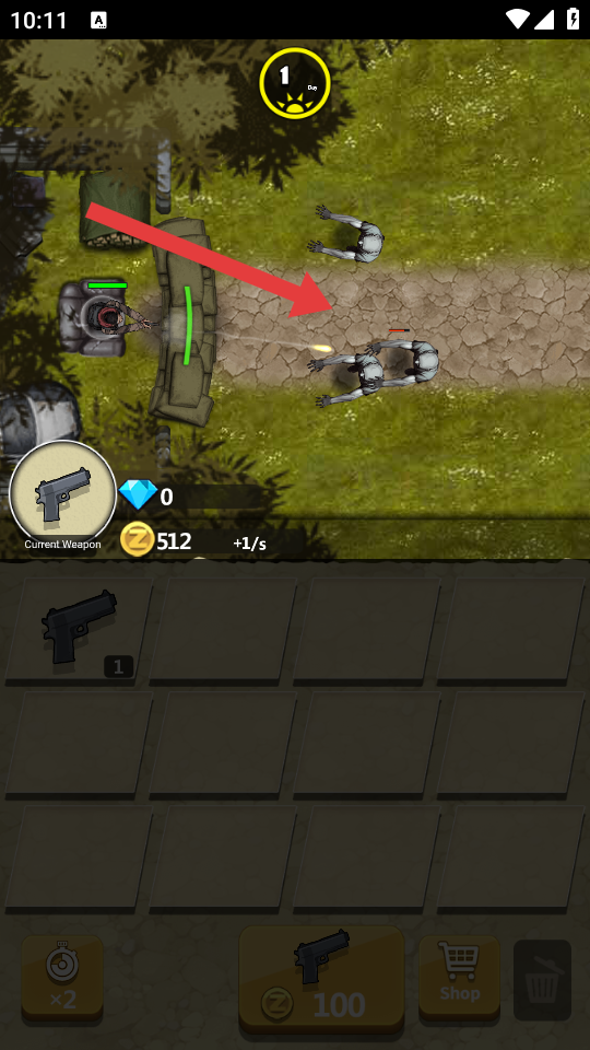 2、長(zhǎng)按屏幕射擊,攻擊路徑上出現(xiàn)的僵尸,借助槍械持續(xù)輸出,注意僵尸移動(dòng)方向,調(diào)整射擊的節(jié)奏。