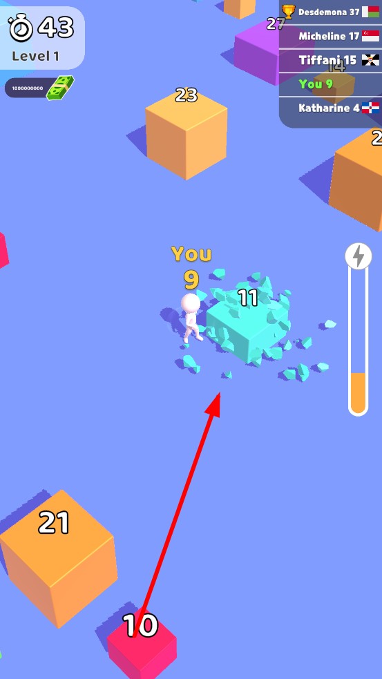 1、開局策略:開局優(yōu)先清剿數(shù)字≤五的方塊,憑借低門檻快速積累基礎(chǔ)數(shù)字;遇數(shù)字一的方塊必?fù)?,瞬間提升戰(zhàn)力,洞察對手動向,規(guī)避正面沖突。