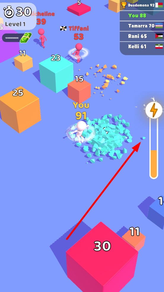 2、擊打足夠多的方塊蓄力,激發(fā)閃電圖標(biāo),瞬間擊打速度增快,觀察其他玩家行動軌跡,預(yù)判目標(biāo)方塊,進(jìn)行搶占。