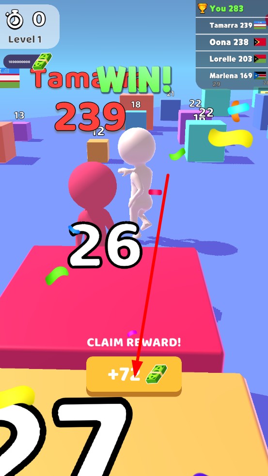 3、倒計時歸零后,依據(jù)頭頂數(shù)字總和判定最終排名,點(diǎn)擊CLAIM REWARD按鈕領(lǐng)取金幣資源,用于升級攻擊、移動速度,或解鎖新穎火柴人皮膚。