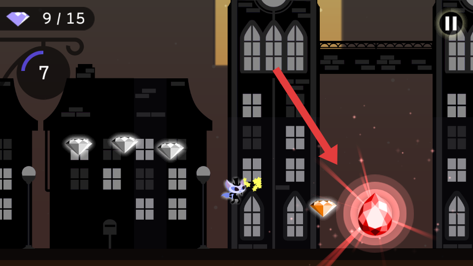 1、進(jìn)入游戲,操控貓怪盜的角色,利用虛擬的按鍵或滑動(dòng)來(lái)控制移動(dòng),優(yōu)先抓取紅色的寶石目標(biāo)。