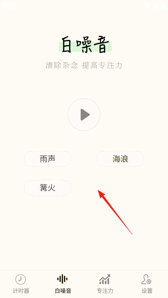 2、此為白噪音功能界面,這里提供了雨聲,海浪,篝火等多種白噪音選項,用戶可自由挑選,播放白噪音能夠幫助清除雜念,有效提高專注力,適合在需要靜心專注的時刻使用。
