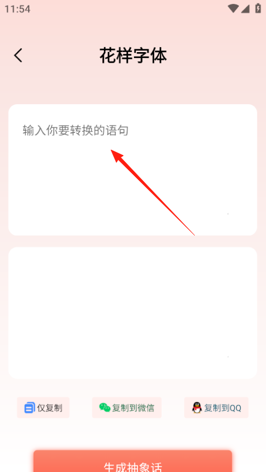 1、該界面是花樣字體功能板塊,用戶可在輸入框中錄入想要轉(zhuǎn)換的語(yǔ)句,隨后能通過(guò)不同按鈕,將轉(zhuǎn)換后的字體內(nèi)容分享至對(duì)應(yīng)的平臺(tái),滿足在不同社交場(chǎng)景下使用特殊字體的需求。