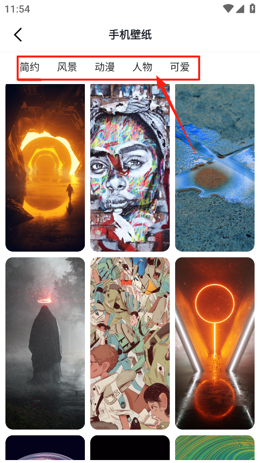 2、此界面為手機(jī)壁紙功能區(qū)域,這里劃分了簡(jiǎn)約,風(fēng)景,動(dòng)漫等多個(gè)壁紙分類(lèi),用戶可以根據(jù)自己的喜好,從不同分類(lèi)中挑選心儀的壁紙,讓手機(jī)桌面呈現(xiàn)出獨(dú)特的視覺(jué)效果。