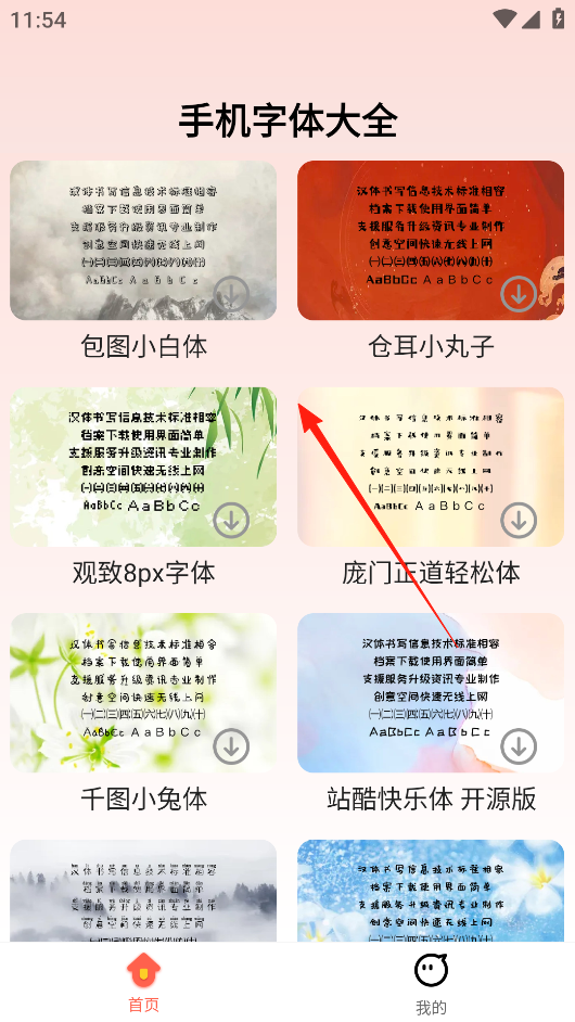 3、該界面展示的是手機(jī)字體大全功能,每種字體都有相應(yīng)的預(yù)覽展示,用戶能夠直觀地看到字體樣式,進(jìn)而選擇下載喜歡的字體來(lái)更換手機(jī)字體。