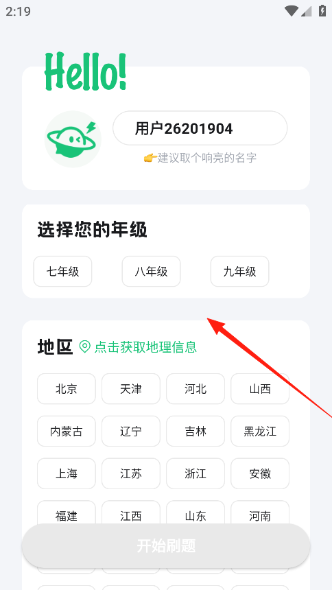 1、用戶可在此選擇自己的年級(jí),從七年級(jí)到九年級(jí)都有涵蓋,還能選擇所在地區(qū),也可點(diǎn)擊獲取地理信息來(lái)自動(dòng)定位,完成年級(jí)和地區(qū)選擇后,就能開(kāi)啟刷題等學(xué)習(xí)相關(guān)操作。