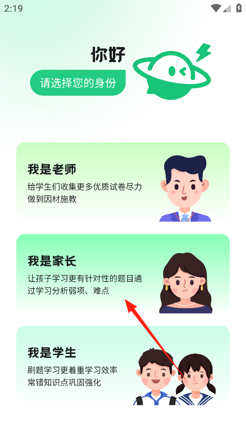 2、此界面用于選擇用戶身份,有三個(gè)選項(xiàng),老師身份可收集優(yōu)質(zhì)試卷,家長(zhǎng)身份能讓孩子學(xué)習(xí)更具針對(duì)性,學(xué)生身份則側(cè)重學(xué)習(xí)效率,強(qiáng)化常錯(cuò)知識(shí)點(diǎn)鞏固。