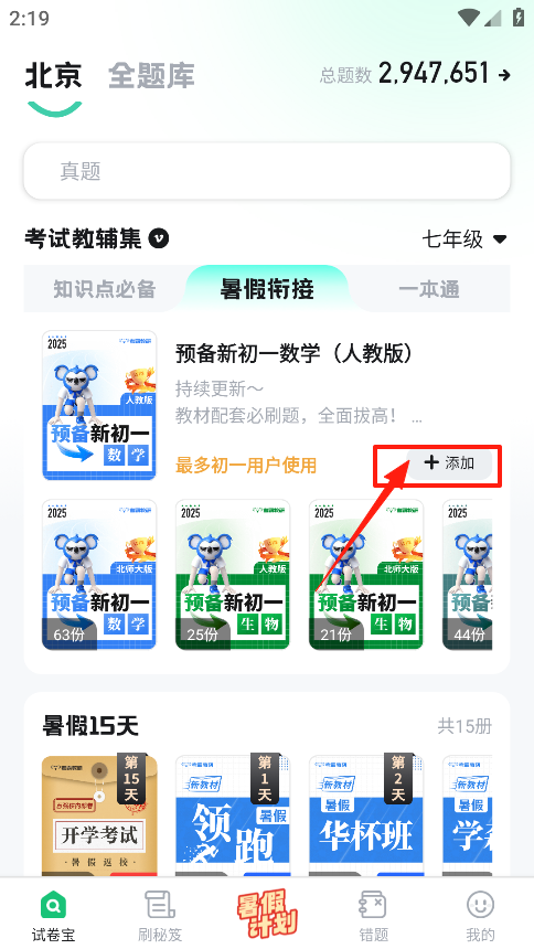 3、有考試教輔集等板塊,包含不同學(xué)科的教輔資料,如預(yù)備新初一數(shù)學(xué)等,看到心儀的教輔資料后,點(diǎn)擊添加按鈕,即可將其加入自己的學(xué)習(xí)資源列表,方便后續(xù)進(jìn)行學(xué)習(xí)和刷題。