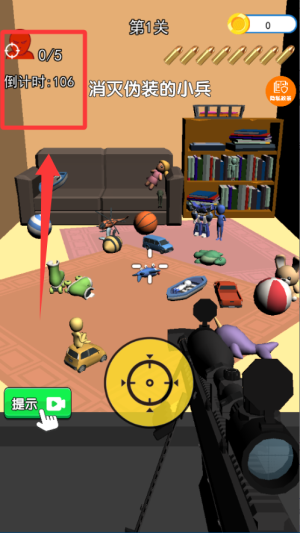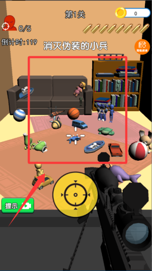 1、進入關卡后先別急著開槍,仔細觀察畫面每個角落,隱藏目標可能藏在樹后或窗戶邊,看清楚再行動。