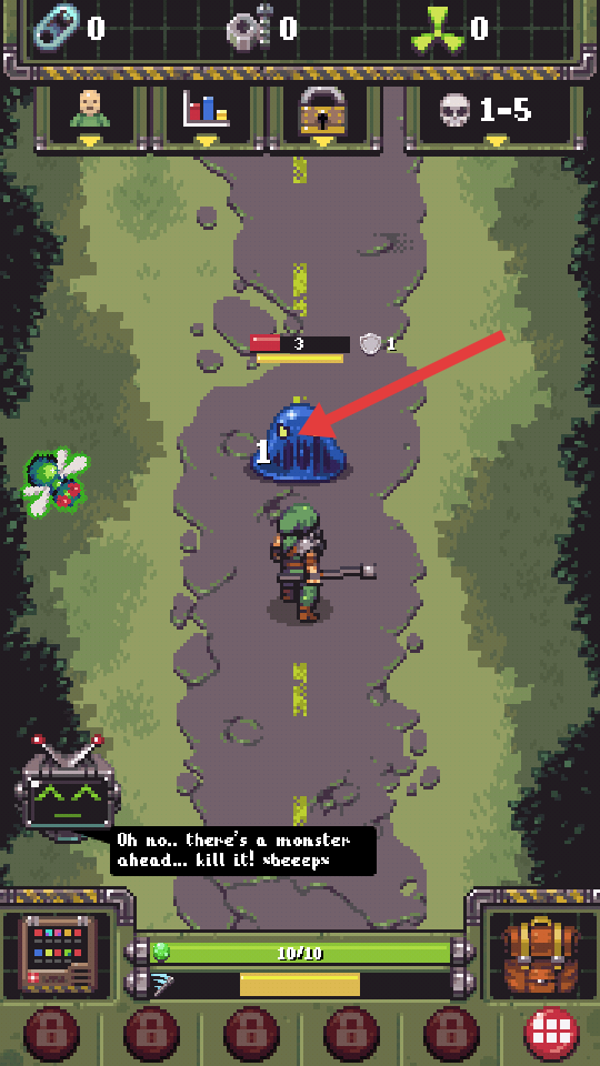 2、前行遇藍(lán)色怪物,根據(jù)提示前面有一個(gè)怪獸,要操控角色靠近進(jìn)行屏幕點(diǎn)擊攻擊,熟悉戰(zhàn)斗操作。