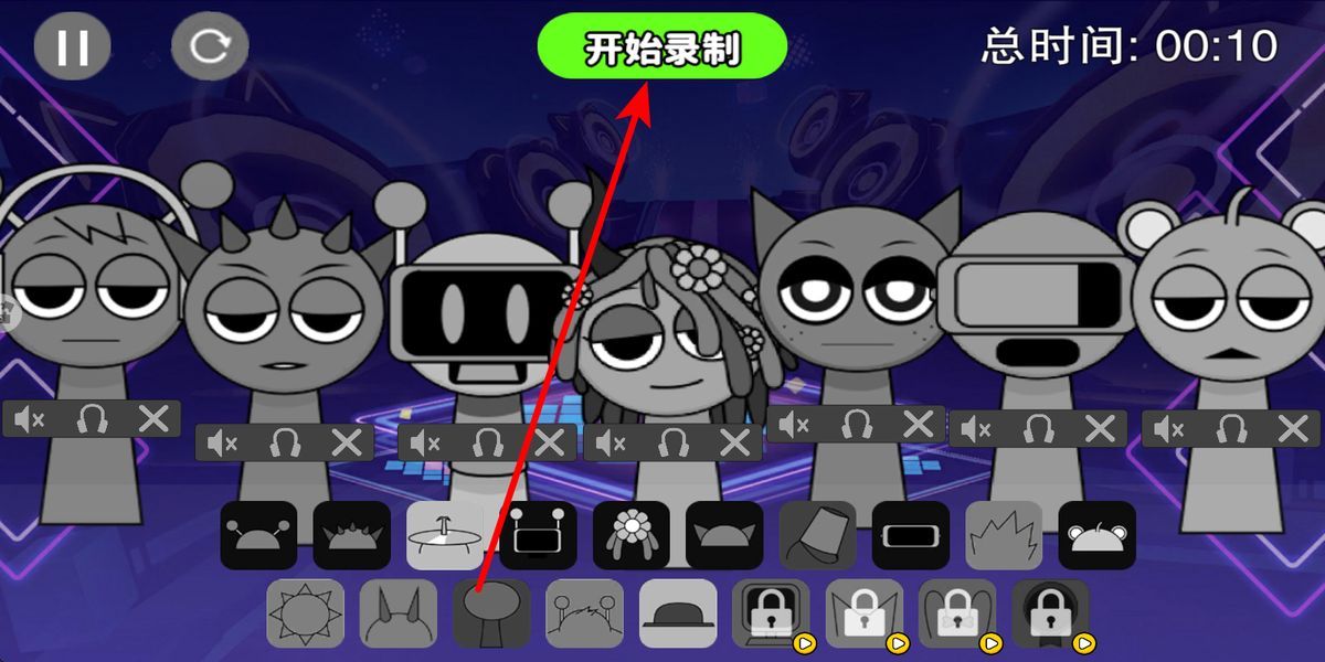 2、進入創(chuàng)作界面,點擊開始錄制,面對角色與下方節(jié)奏元素,選擇元素為角色添加,觸發(fā)節(jié)奏,按想法編排節(jié)奏順序,嘗試組合,打造專屬節(jié)奏旋律。