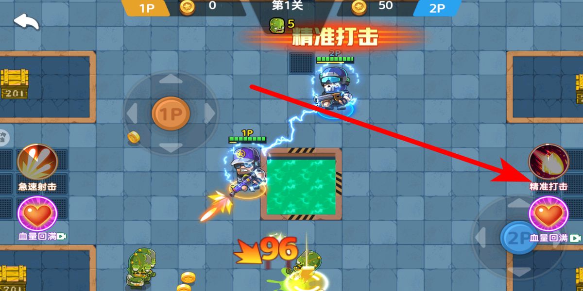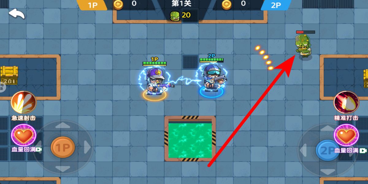 2、操控角色移動(dòng),遇僵尸時(shí),雙人配合走位,利用普攻持續(xù)輸出,把握時(shí)機(jī)同步釋放技能,如精準(zhǔn)打擊,集中火力快速消滅高威脅僵尸保持節(jié)奏。