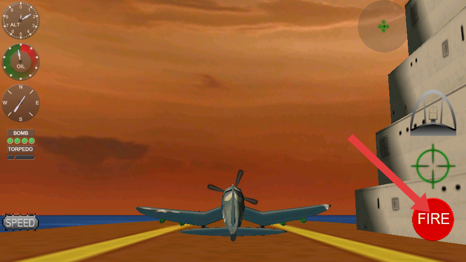 1、進(jìn)入游戲,操控戰(zhàn)機(jī)在航母跑道準(zhǔn)備,瞄準(zhǔn)右側(cè)目標(biāo),點(diǎn)擊FIRE按鈕,需要熟悉射擊基礎(chǔ)的操作。