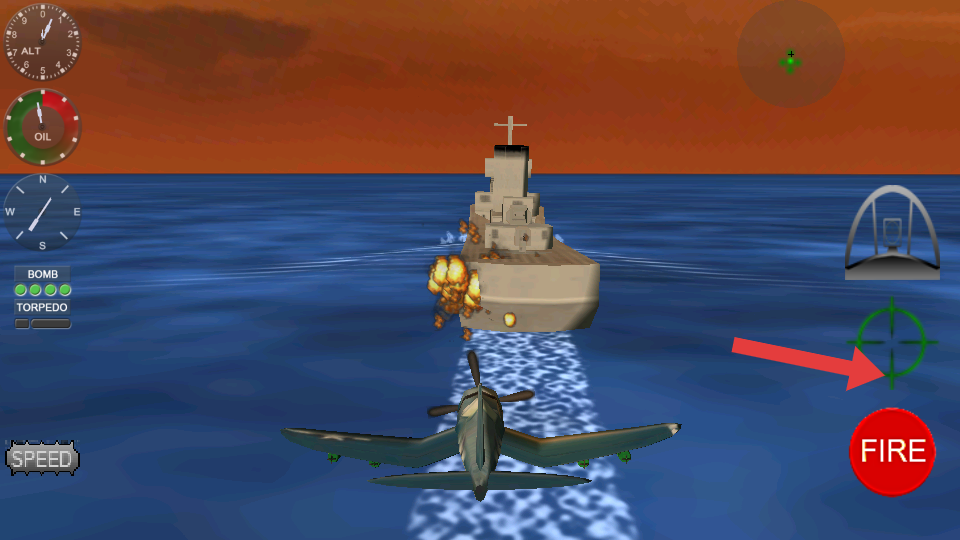 2、飛行中鎖定海上戰(zhàn)艦,調(diào)整戰(zhàn)機(jī)位置,待準(zhǔn)星對(duì)準(zhǔn)艦艇,點(diǎn)擊FIRE開(kāi)火,觸發(fā)到攻擊傷害的目標(biāo)。