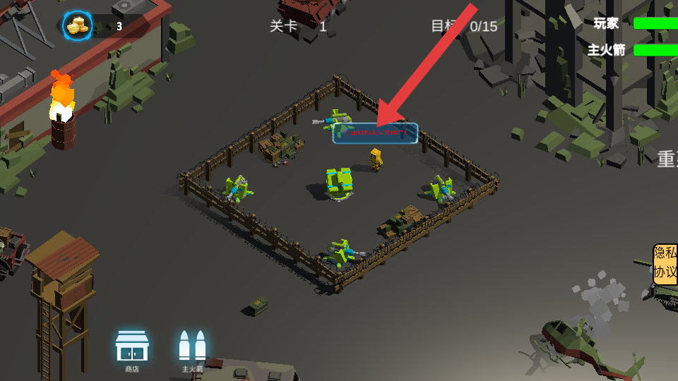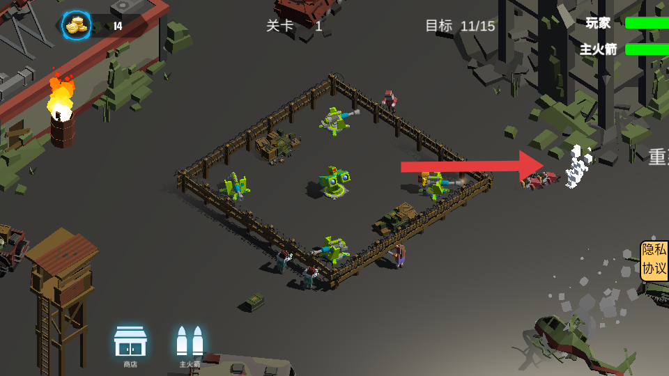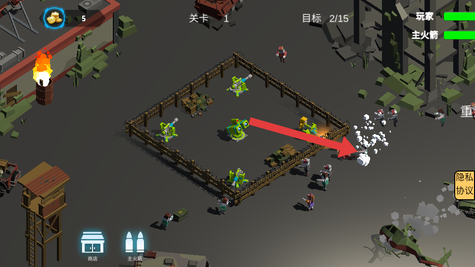 1、進(jìn)入關(guān)卡1,優(yōu)先點(diǎn)擊商店,用初始金幣購買基礎(chǔ)綠色機(jī)甲,拖放至圍欄陣地?cái)橙吮亟?jīng)路線。