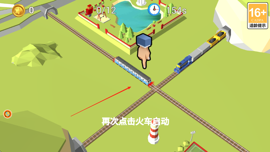 1、進(jìn)入游戲,查看限時(shí)【154s】與任務(wù)進(jìn)度【0/12】,點(diǎn)擊火車暫停,再次點(diǎn)擊按紅箭頭方向啟動火車,避免碰撞。